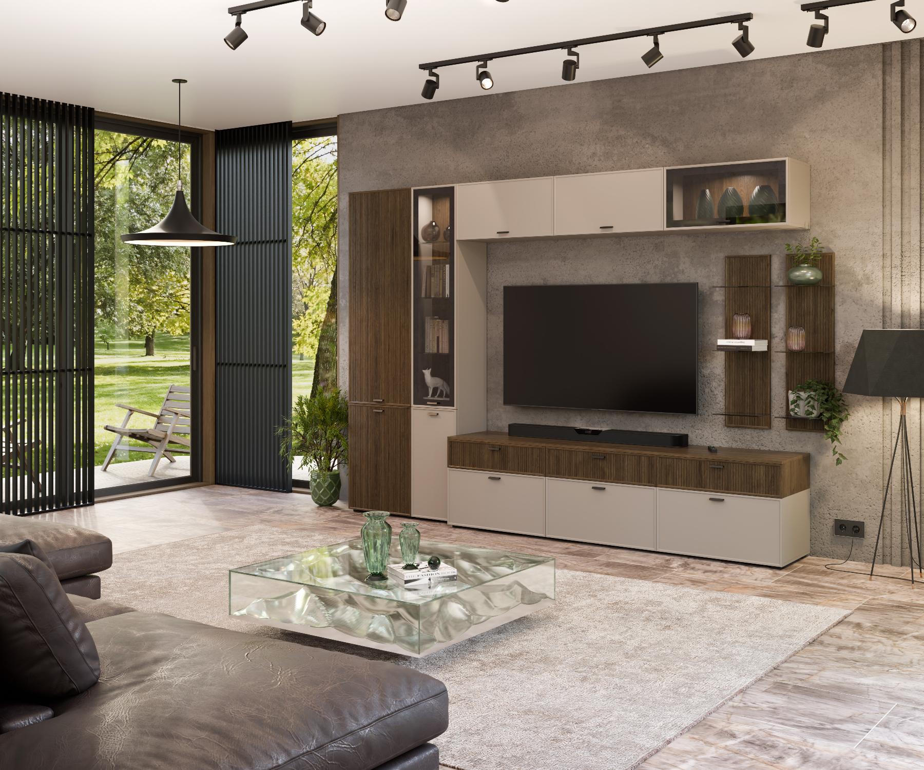 Сочетание нейтральных фоновых цветов, акцентных текстур дерева
