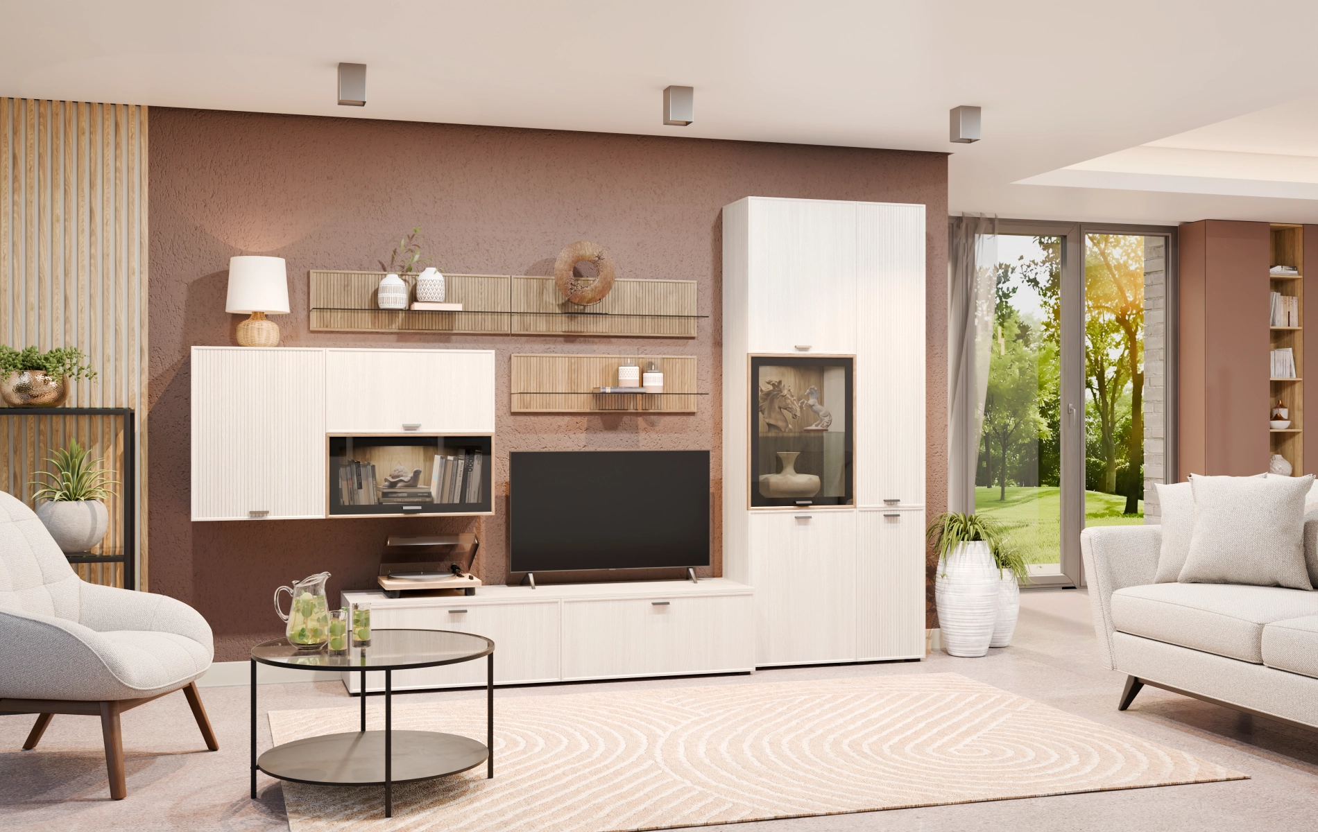 Сочетание нейтральных фоновых цветов, акцентных текстур дерева